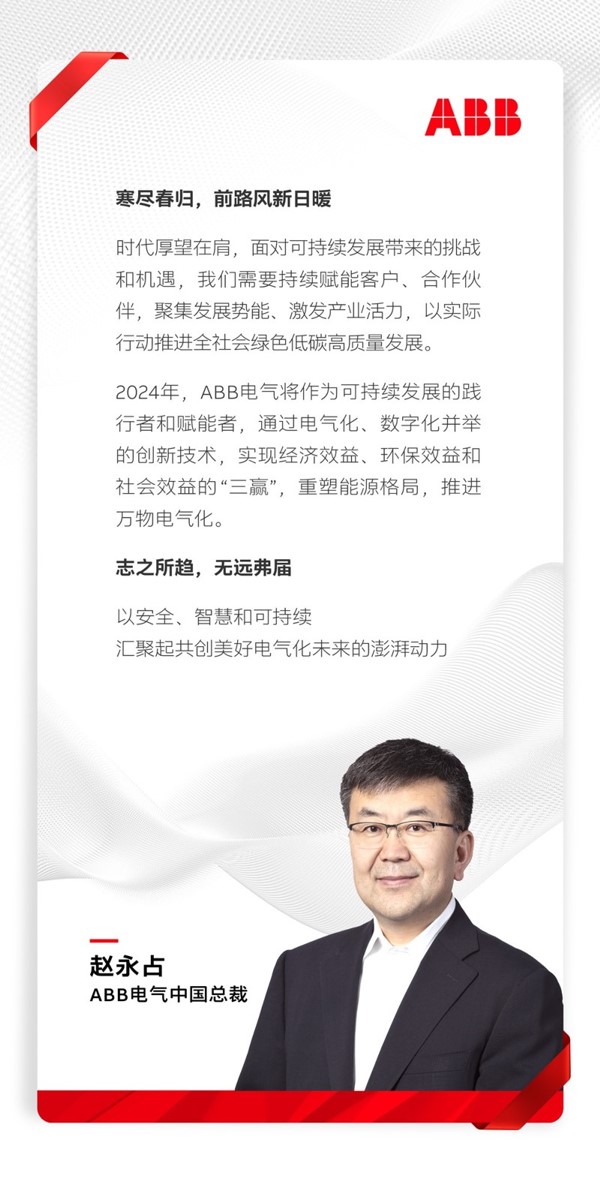 In 2024, ABB Electric will serve as a practitioner and enabler of sustainable development. Through innovative technologies that promote both electrification and digitalization, ABB Electric will achieve a "triple win" of economic benefits, environmental benefits and social benefits, reshape the energy landscape, and promote the sustainable development of all things. Electrification.